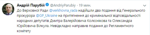 "В Верховную Раду поступили два представления от генерального прокурора на привлечение к уголовной ответственности народных депутатов Дмитрия Валерьевича Колесникова и Александра Юрьевича Вилкула. Безотлагательно направил представления в Регламентный комитет", - написал Парубий в своем аккаунте в Twitter в пятницу днем.