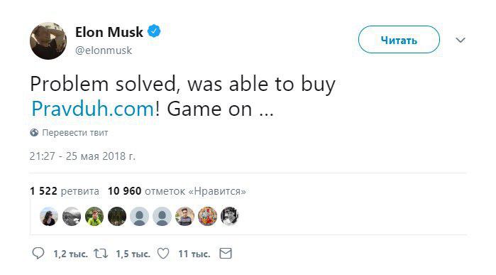 "Задача решена, получилось купить Pravduh.com Игра начинается...", написал он в своем Твиттер.