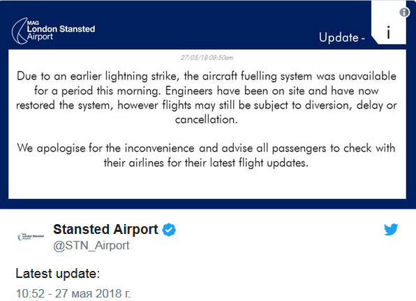 "В результате удара молнии система заправки самолетов пришла в неисправность этим утром", - написал представитель аэропорта в своем Twitter.