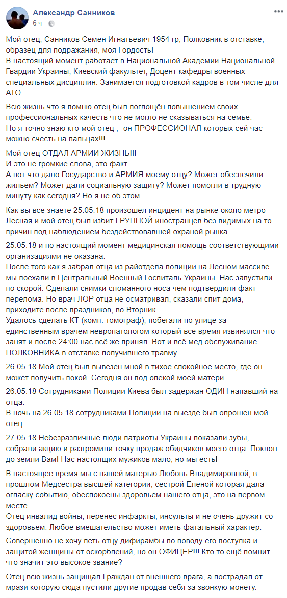 В соцсетях не утихают страсти после случая с избиением военного пенсионера в Киеве, когда 26 мая на рынке у метро "Лесная" мужчину избили торговцы с Кавказа. "Страна" разыскала страницу Александра Санникова, который приходится сыном пострадавшему мужчине.