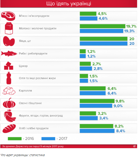 Поскольку сумма расходов и доходов украинцев почти одинакова, то расходы на еду составляют почти 50% от доходов. Для сравнения: жители Великобритании тратят на питание 8,1% доходов, поляки – 16,5%.