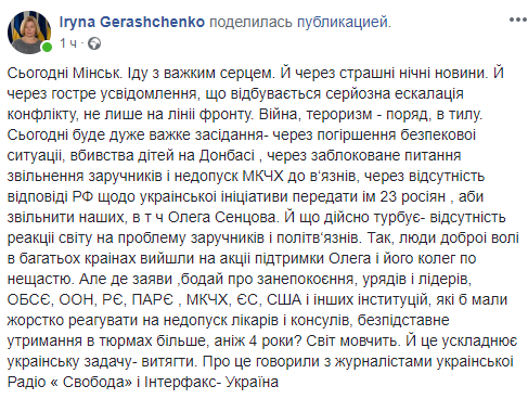 "Сегодня будет очень тяжелое заседание - из-за ухудшения ситуации с безопасностью, убийства детей на Донбассе, из-за заблокированного вопроса освобождения заложников и недопуск МККК к заключенным при отсутствии ответа РФ по украинской инициативе передать им 23 россиян, чтобы освободить наших, в том числе Олега Сенцова", - добавила Геращенко.