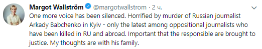 "Еще один голос замолчал. В ужасе из-за убийства российского журналиста Аркадия Бабченко в Киеве - это лишь один из последних случаев среди убийств оппозиционных журналистов в России и за рубежом. Важно, чтобы ответственные были привлечены к ответственности", - написала руководительница шведского МИД Маргот Валльстрём в в Twitter.