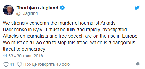 "Мы решительно осуждаем убийство журналиста Аркадия Бабченко в Киеве. Его должны быстро расследовать", - написал он.