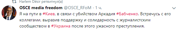 "Я на пути в Киев в связи с убийством Аркадия Бабченко. Встречусь с его коллегами, выражу поддержку и солидарность с журналистским сообществом в Украине после этого ужасного преступления", - написал Дезир.