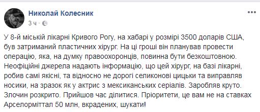 В то же время, депутат горсовета Кривого Рога Николай Колесник в Facebook написал, что "на эти деньги хирург планировал провести операцию, которая, по мнению правоохранителей, должна быть бесплатной".