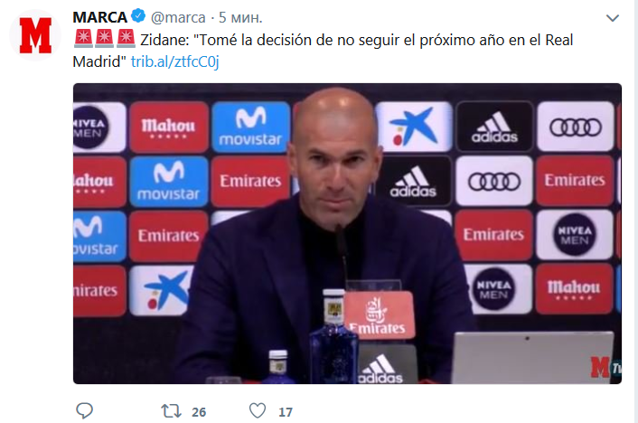 Сегодня, 31 мая, главный тренер Реала Зинедин Зидан созвал экстренную пресс-конференцию и озвучил сенсационное решение. Он покидает свой пост после феноменального сезона, в котором его команда в третий раз подряд выиграла Лигу Чемпионов.