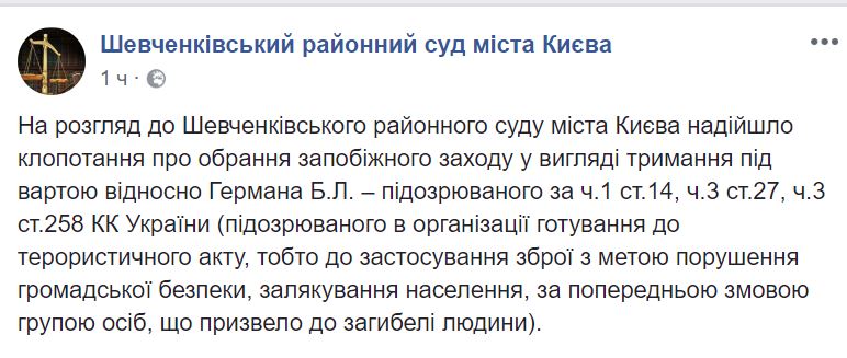 20:21  Слово у защиты. Адвокат говорит, что статья "теракт" в подозрении никак не обоснована. Ведь убийство того же Шеремета и Вороненкова имеют традиционную квалификацию - умышленное убийство.