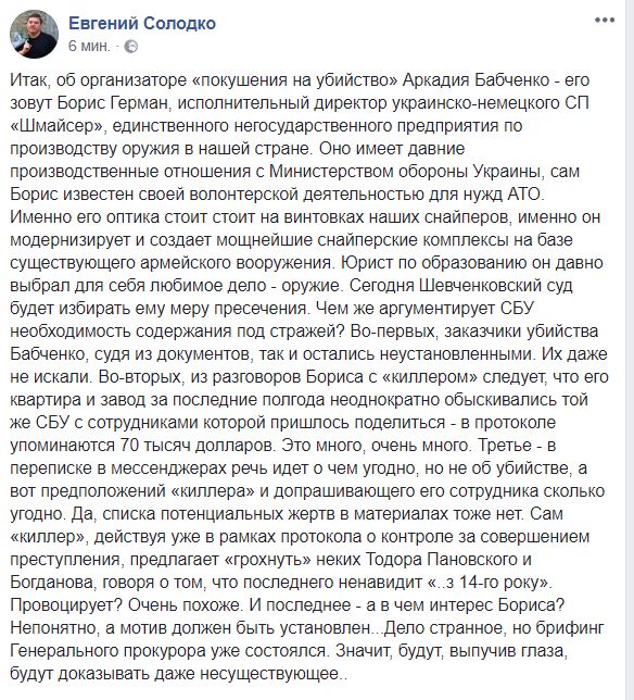 И мы до сих пор так и не услышали имя заказчика покушения на журналиста. С организатором Борисом Германом - отдельная непонятная история. Ну, а где видео, на котором он заказывает именно убийство Бабченко? А не просто кусок, на котором он деньги считает.