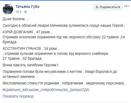 Также из-за пулевого ранения в голову от вражеского снайпера, полученного 27 мая, умер боец ​​92 бригады 34-летний Константин Гранов.