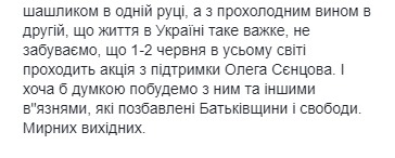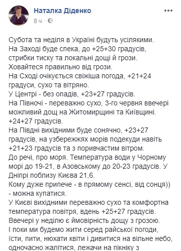 "На Западе будет жара до + 25 ...+ 30 градусов, скачки давления и локальные дожди и грозы. Прячьтесь правильно от грозы. На Востоке ожидается свежая погода, + 21... + 24 градуса, сухо и ветрено. В Центре - без осадков, + 23... + 27 градусов. На севере - преимущественно сухо, 3 июня вечером возможен дождь на Житомирщине и Киевщине. + 24... + 27 градусов. На юге выходные будет солнечно, + 23... + 27 градусов, на побережье морей иногда даже + 21... + 23 градусов и с порывистым ветром". - утверждает синоптик.