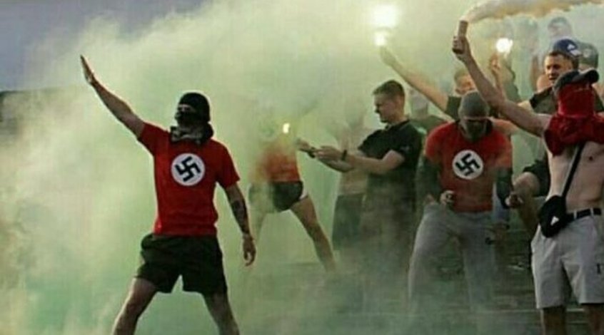 Несколько фанов в красных футболках со свастикой на трибунах зажгли фаеры и выкрикивали кричалки. Свастика на красном фоне - это флаг нацистской Германии.