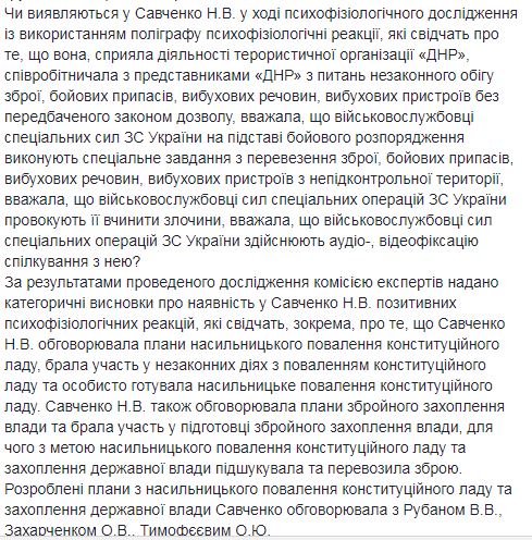 "По результатам проведенного исследования комиссией экспертов даны категоричные выводы о наличии у Савченко Н.В. положительных психофизиологических реакций, свидетельствующих, в частности, о том, что Савченко Н.В. обсуждала планы насильственного свержения конституционного строя, участвовала в незаконных действиях по свержению конституционного строя и лично готовила насильственное свержение конституционного строя", - отмечается в сообщении.