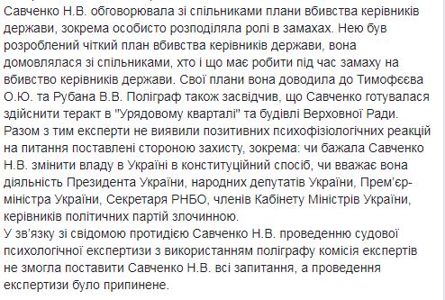 "Савченко Н.В. обсуждала с сообщниками планы убийства руководителей государства, в частности лично распределяла роли в покушениях. Ею был разработан четкий план убийства руководителей государства, она договаривалась с сообщниками, кто и что должен делать во время покушения на убийство руководителей государства. Свои планы она доводила до Тимофеева А.Ю. и Рубана В.В. Полиграф также показал, что Савченко готовилась осуществить теракт в "Правительственном квартале" и здания Верховной Рады", - говорится в сообщении СБУ.