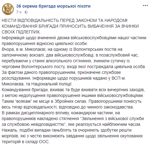 В Николаеве, на одном из волонтерских постов на железнодорожном вокзале, двое военнослужащих во внеслужебное время, находясь в состоянии алкогольного опьянения, устроили схватку со служащим, в ходе которого пострадало гражданское лицо. По факту данного правонарушения назначено служебное расследование. Командиром части на правонарушителей наложено взыскание "Освобождение от военной службы по служебному несоответствию", которое реализуется в ближайшее время", - говорится в сообщении.