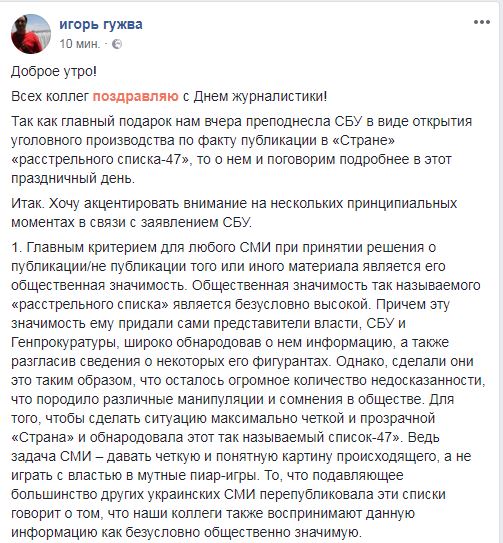 Об этом написал главный редактор "Страны" Игорь Гужва на своей странице в Facebook.