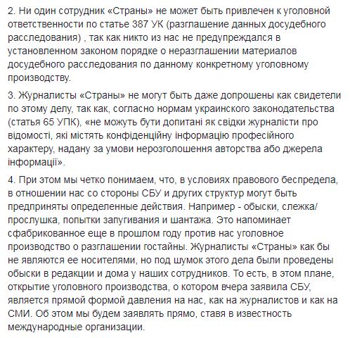 3. Журналисты «Страны» не могут быть даже допрошены как свидетели по этому делу, так как, согласно нормам украинского законодательства (статья 65 УПК), «не можуть бути допитані як свідки журналісти про відомості, які містять конфіденційну інформацію професійного характеру, надану за умови нерозголошення авторства або джерела інформації».