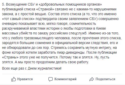 5. Возмущение СБУ и «добровольных помощников органов» публикацией списка «Страной» связано не с какими-то нарушениями закона, а с простой вещью. Состав этого списка (а то, что это именно «тот самый список» подтвердила своим заявлением СБУ) совершенно очевидно показывает всю, мягко говоря, сомнительность раскручиваемой властями истории о якобы подготовки в Киеве массовых убийств по заказу российских спецслужб. Именно из-за того, что у любого трезвомыслящего человека, после прочтения этого списка, зародятся большие сомнения в официальной версии следствия, его и не обнародовали до сих пор. Стремясь сохранить мутную интригу, на фоне которой хотели заработать пиар-дивиденды. После публикации «Страны» этого уже не получится. Потому так и злятся. Ну, пусть злятся. А мы просто продолжим делать свою работу", - написал главный редактор "Страны" и поздравил коллег с Днем журналиста, который отмечается сегодня, 6 июня.