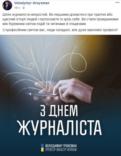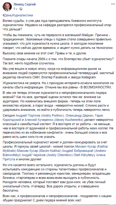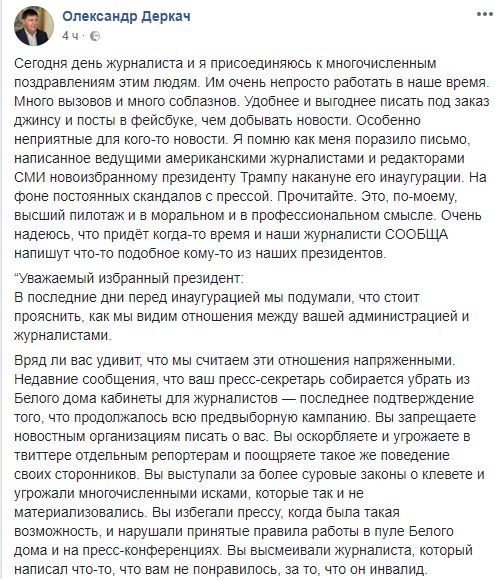 "Сегодня день журналиста и я присоединяюсь к многочисленным поздравлениям этим людям. Им очень непросто работать в наше время. Много вызовов и много соблазнов. Удобнее и выгоднее писать под заказ джинсу и посты в фейсбуке, чем добывать новости. Особенно неприятные для кого-то новости.