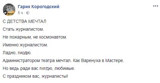 Ладно, п**дю. Администратором театра мечтал. Как Варенуха в Мастере. Но ведь ради вас п**дю, любимые. С праздником вас, журналисты!"