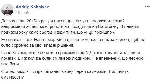 "Не удивляет ничего. Даже мэр Киева, временно бежал за границу, чтобы не было стыдно за свои собственные решения. Господин Кличко может дебаты в прямом эфире? Хватит прятаться за спины прислужников. Вы же когда-то были смелым человеком. Не уверен, что честным, но были ... Обсудим все спорные вопросы вживую перед камерами. Хватит смелости?", - написал он.