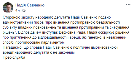 "Надежда обжалует решение о привлечении к ответственности и арест, которые позорно, незаконным образом, проголосованы парламентом", - пояснила пресс-служба суть иска.