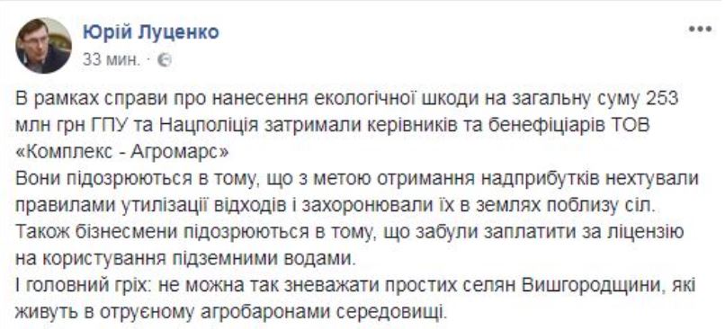 Через пару часов эту информацию официально подтвердил генеральный прокурор Юрий Луценко. На своей странице в Facebook он сообщил, что Генпрокуратура и Нацполиция задержали руководителей и бенефициаров ООО "Комплекс - Агромарс" (торговая марта "Гавриловские курчата") по делу о нанесении экологического ущерба на 253 млн гривен.