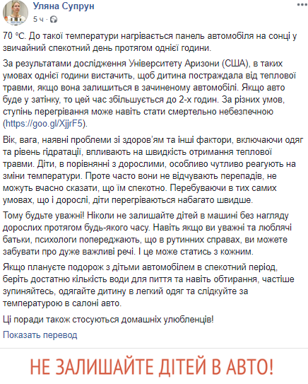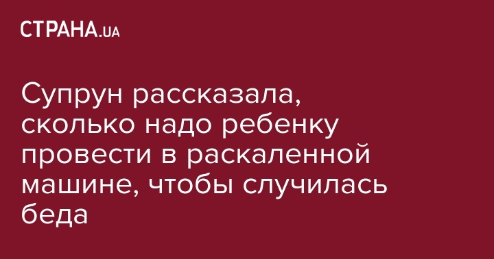 Ульяна Супрун поведала украинцам о том, сколько времени ребенку достаточно провести в раскаленном на солнце автомобиле для того, чтобы произошла беда. Об этом Ульяна Супрун написала на своей странице в Facebook.