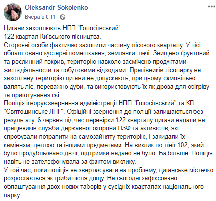 Поводом для сюжета стал размещенный в соцсети пост сотрудника национального парка "Голосеевский" Александра Соколенко, который рассказал, что поселенцы уничтожают почвенный и растительный покров, засоряют территорию вокруг продуктами жизнедеятельности и бытовыми отходами.