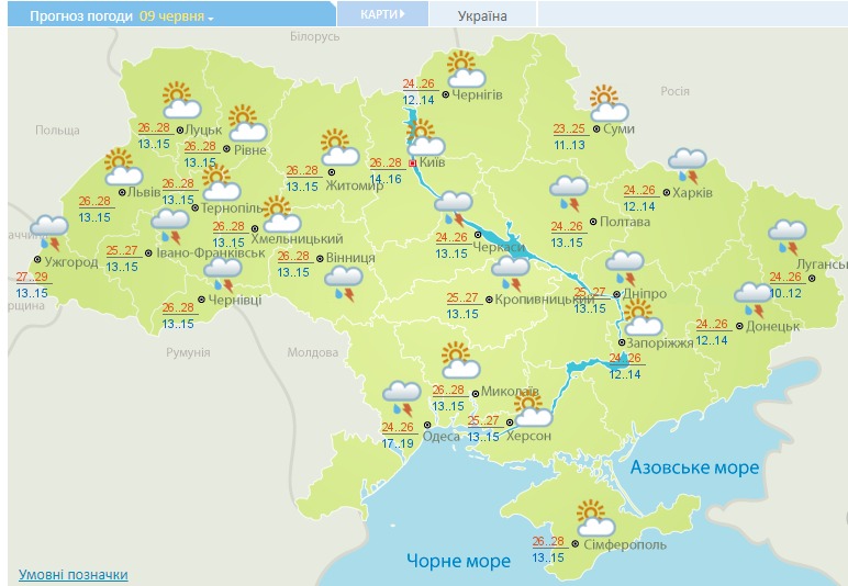 Температура ночью 11-16°, днем 24-29 °, в восточных, Черниговской, Сумской, Полтавской областях ночью 7-12°, днем 20-25°.