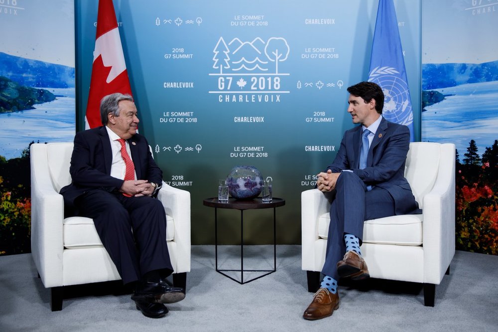 Для сравнения – генсеку ООН Антонио Гуттеришу Трюдо улыбался и даже показал свои, как всегда яркие, дизайнерские носки.