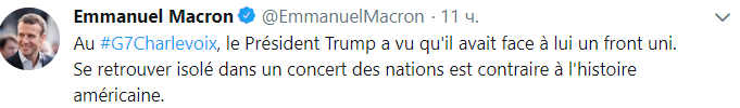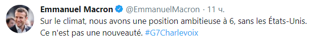 Вообще Twitter французского президента – это какой-то каталог упреков и подколов в отношении американской позиции на саммите G7. Вот несколько цитат: