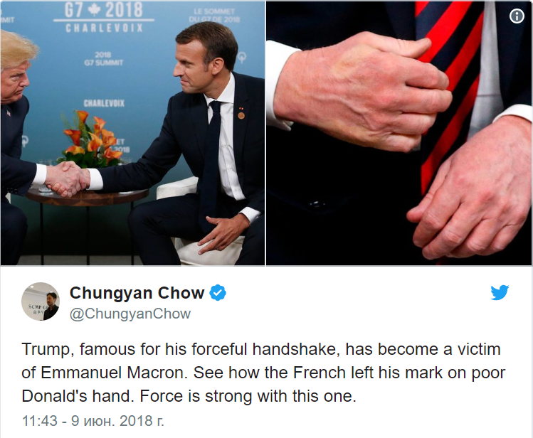 Так, мировые СМИ облетело фото на котором президент Франции Эмманюэль Макрон на встрече G7 буквально сдавил руку Дональда Трампа – так, что у президента США остались следы от "железных пальцев" француза.