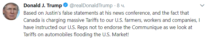 Заявления Трюдо он назвал "ложными утверждениями" и ответил, что "Канада обложила американских фермеров и компании огромными тарифами".
