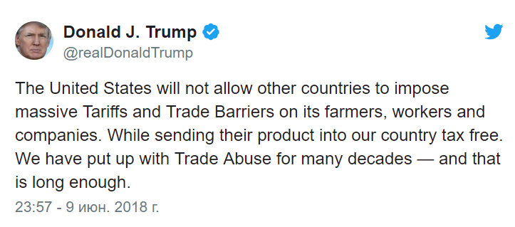 Уже в день отлета с полей саммита Трамп написал твит, в котором подвел своебразные итоги своего общения с остальными лидерами:
