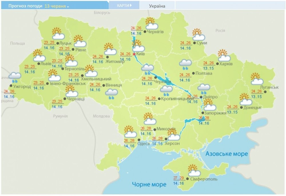 В среду, 13 июня, дожди будут лишь в центральных регионах. На остальной территории будет сухо и тепло. Температура ожидается +24...+26 тепла, местами до +27.