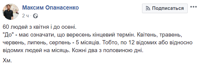 "60 человек с апреля и до осени. "До" - должно означать, что сентябрь конечный срок. Апрель, май, июнь, июль, август - 5 месяцев. То есть, по 12 известных или относительно известных людей в месяц. Каждые два с половиной дня", - подсчитал производительность труда "Аристарха" журналист Максим Опанасенко.