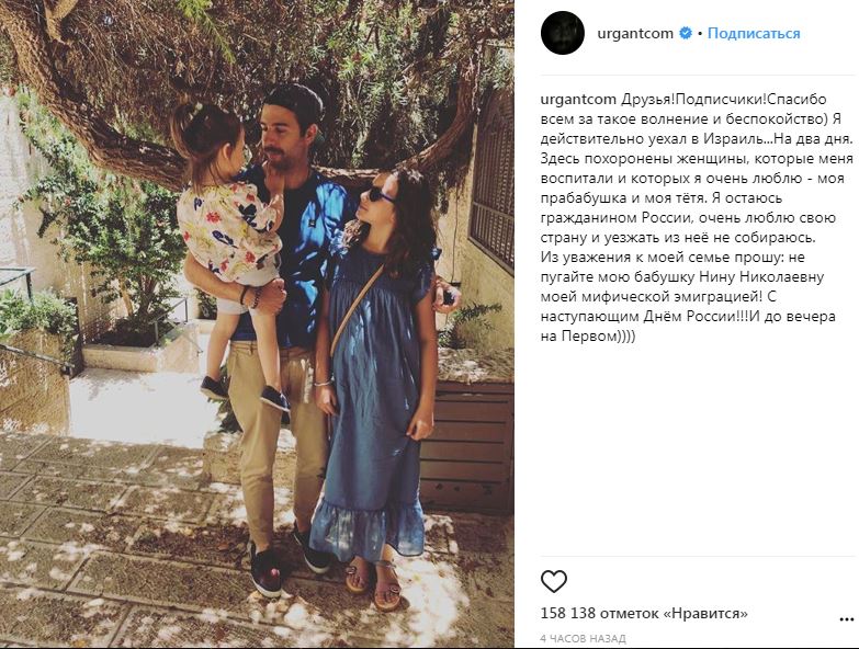 "Я действительно уехал в Израиль... на два дня. Здесь похоронены женщины, которые меня воспитали и которых я очень люблю — моя прабабушка и моя тетя. Я остаюсь гражданином РФ, очень люблю свою страну и уезжать из нее не собираюсь", — подчеркнул Ургант.