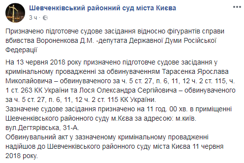 "На 13 июня 2018 года назначено подготовительное судебное заседание по уголовному производству касательно обвинения Тарасенко Ярослава Николаевича - обвиняемого по ч. 5 ст. 27, п. 6, 11, 12 ч. 2 ст. 115, ч. 1 ст. 263 Уголовного кодекса Украины и Лося Александра Сергеевича - обвиняемого по ч. 5 ст. 27, п. 6, 11, 12 ч. 2 ст. 115 УК Украины", - говорится в сообщении.