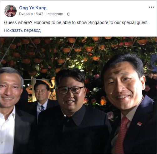 Третий человек на фотографии - министр образования Сингапура Онг Е Кунг, который также сделал свое селфи с Ким Чен Ыном и выложил на своей странице в Facebook. Подпись к фото гласит: "Угадай где?"