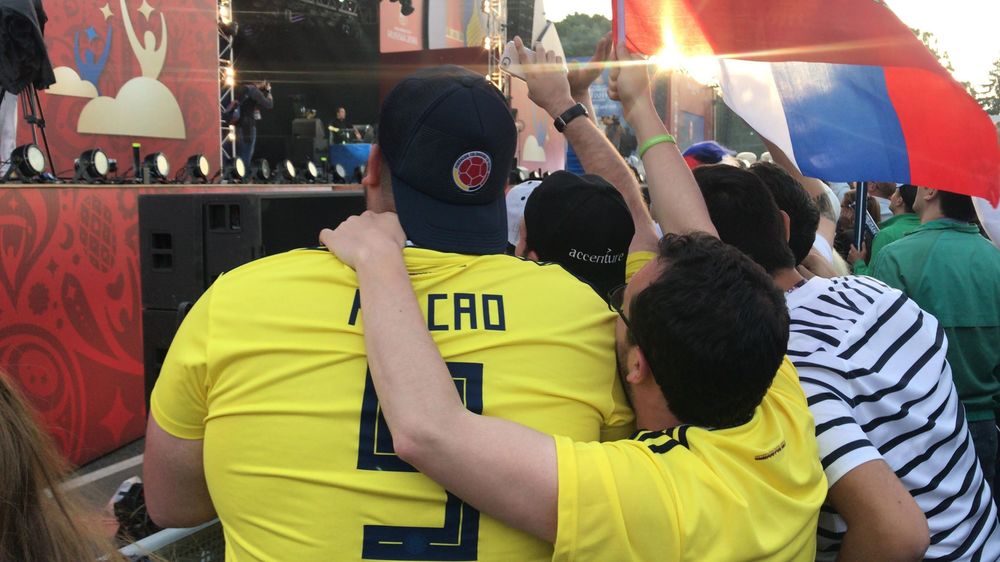 19:33  В толпе много испанской речи. В ЧМ участвуют много сборных из стран Латинской Америкии - поэтому группа поддержки внушительная. Они подбегают к русским, хлопают их по плечам и кричат Russia!