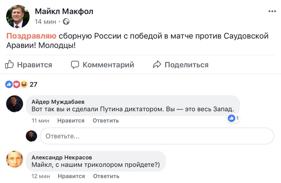 21:05  Экс-посол США в России Майкл Макфол поздравил россиян с победой. Его тут же атаковали украинские активисты.