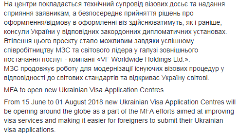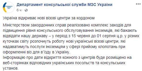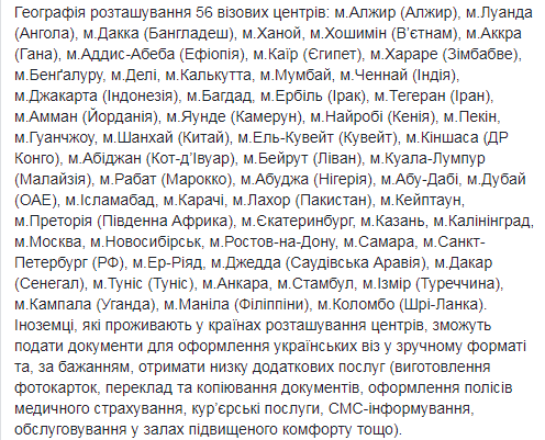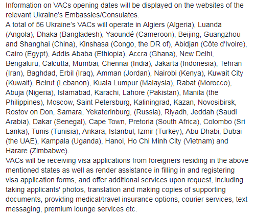 Всего, в период с 15 июня по 1 августа в нескольких странах будут открыты 56 новых визовых центров, которые будут предоставлять иностранцам услуги по приему ходатайств при оформлении виз для въезда на Украину. Восемь из них появятся в российских городах.