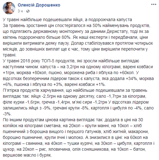 "За май рост цен наблюдался на 50% наименований продуктов, подлежащих государственному мониторингу, тогда как за апрель подорожало более 80%. В мае 2018 года ТОП-5 продуктов, которые подорожали больше всего выглядит следующим образом: капуста - на 3,2 грн на одном килограмме, вареные колбасы - на 1 грн, морковь - на 80 коп., пшено, мороженая рыба и яблоки — на 60 коп. по каждой позиции. В процентах бесспорным лидером является капуста, которая добавила 34%, морковь - 6%, пшонка и яблоки - по 3%, вареные колбасы - 1%”, - написал он в Facebook.