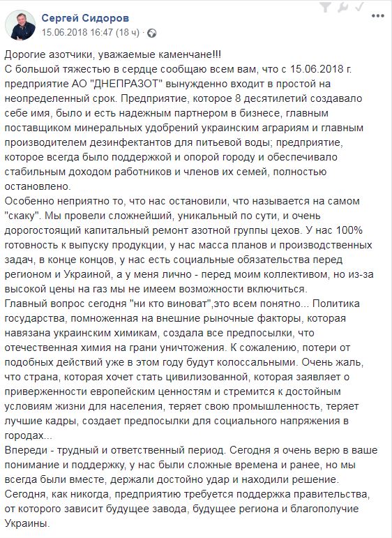 "С большой тяжестью в сердце сообщаю всем вам, что с 15.06.2018 г. предприятие АО "ДНЕПРАЗОТ" вынужденно входит в простой на неопределенный срок. Предприятие, которое 8 десятилетий создавало себе имя, было и есть надежным партнером в бизнесе, главным поставщиком минеральных удобрений украинским аграриям и главным производителем дезинфектантов для питьевой воды; предприятие, которое всегда было поддержкой и опорой городу и обеспечивало стабильным доходом работников и членов их семей, полностью остановлено", - говорится в сообщении.