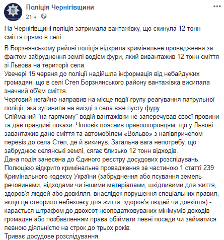 "Пойманный "на горячем" водитель грузовика не отрицал своей вины и дал правдивые показания. Мужчина объяснил правоохранителям, что во Львове загрузил данный мусор и автомобилем Volvo с полуприцепом перевез в село Степь, где и выбросил. Общий вес мусора, загрязняющего крестьянские земли, составляет около 12 тонн", – сказано в сообщении.