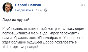 "Клуб подписал пятилетний контракт с атакующим полузащитником Фернандо. Игрок переходит к нам из бразильского "Палмейраса". Уверен, его ждет большое будущее! Добро пожаловать в "Шахтер", Фернандо!" - сообщил в Facebook генеральный директор дончан Сергей Палкин.
