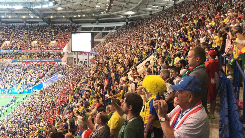 20.34 Чемпионат мира это не только высокий уровень футбола. Это ещё и высокий уровень болельщиков. Нет и намёка на противостояние фанатов разных команд. Люди приехали со всего мира, чтобы посмотреть футбол. И бразильцы, и швейцарцы рьяно поддерживают свои сборные, и при этом уважительно относятся друг к другу, сообщает корреспондент "Страны".