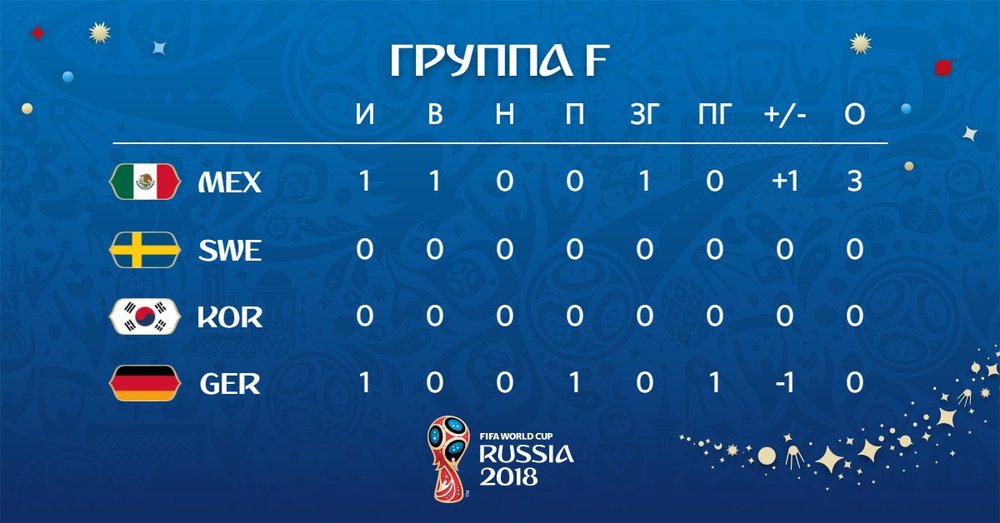 19.59 Положение команд в группе F, где действующие чемпионы мира внезапно оказались на последнем месте.