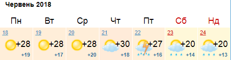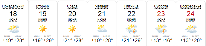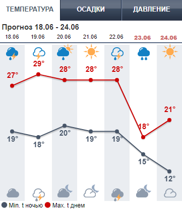 По данным сайта Sinoptik.ua, считает, что гроза будет в пятницу и субботу. Дневная температура +28...+29. В воскресенье столбик термометра днем опустится до +22.